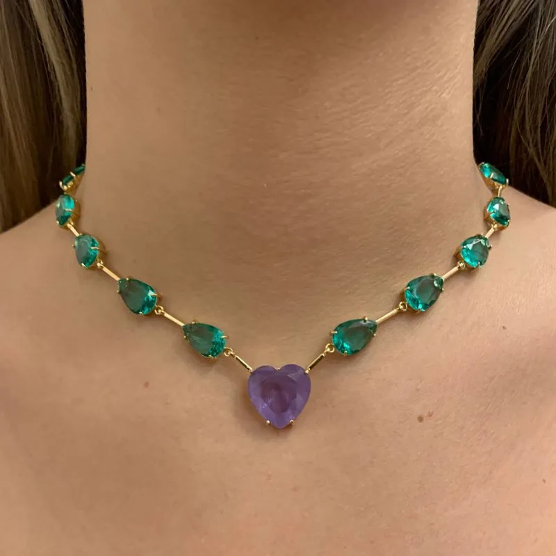 Colar festa gotas verdes e coração roxo fusion