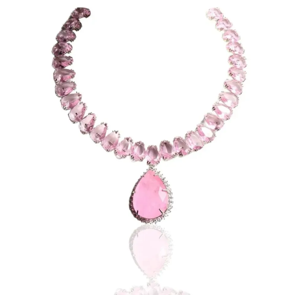 Colar festa gotas rosa cristais e gota grande rosa fusion cravejada cristal em volta pendurada