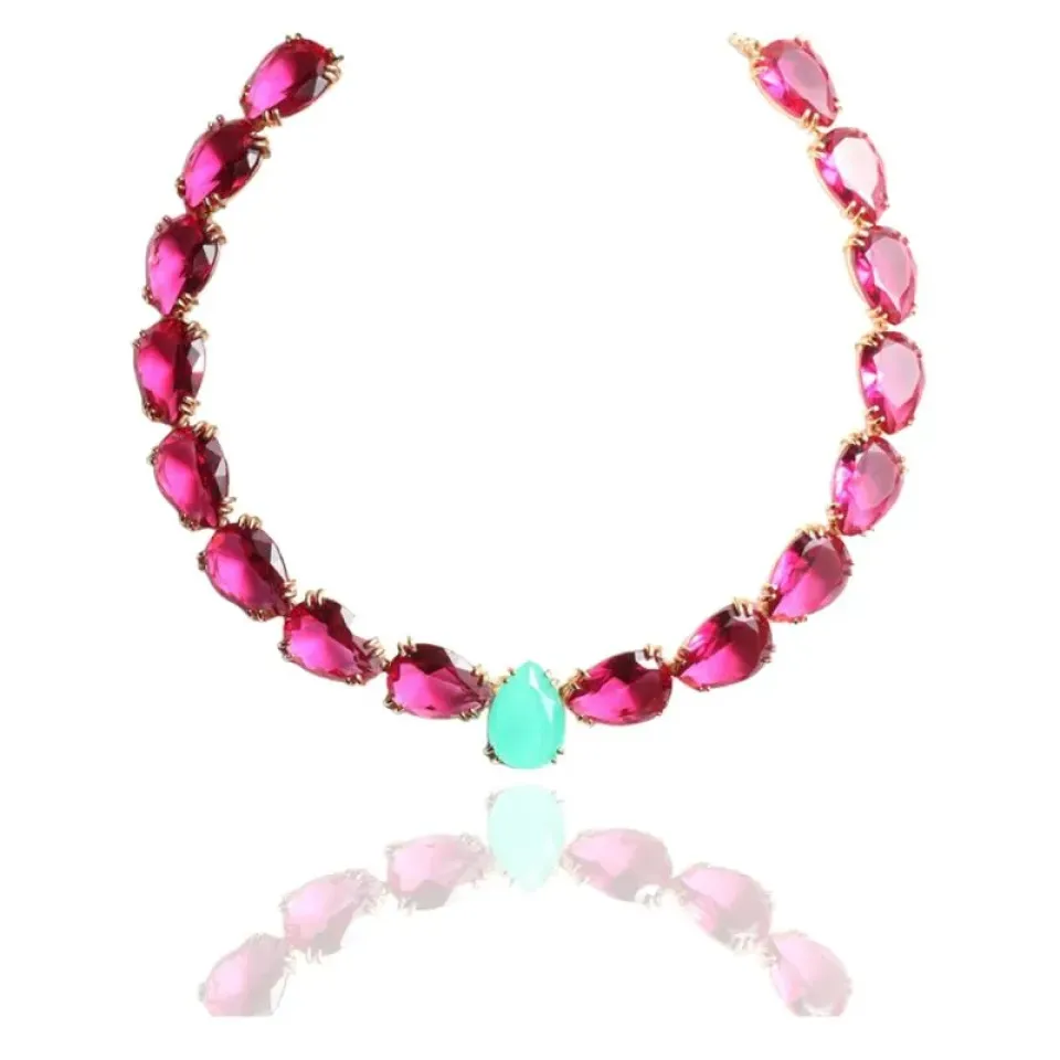 Colar festa pedras gota rosa pink e gota turmalina