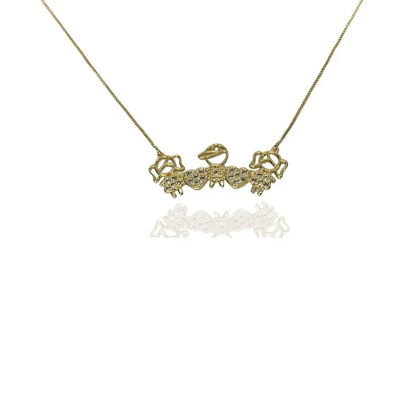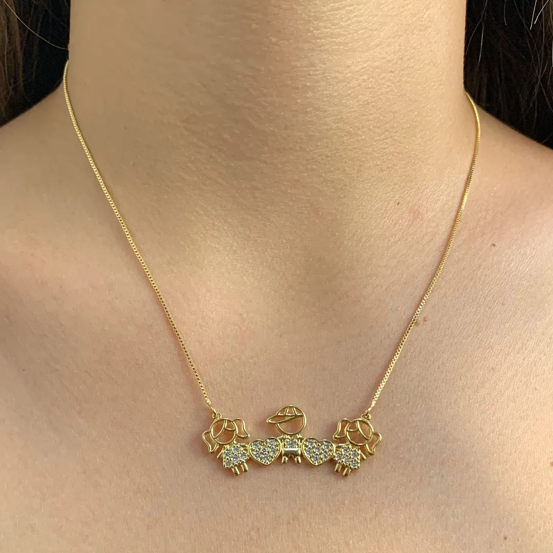 Colar filhos 2 meninas, 1 menino e coração cravejado zircônias cristais
