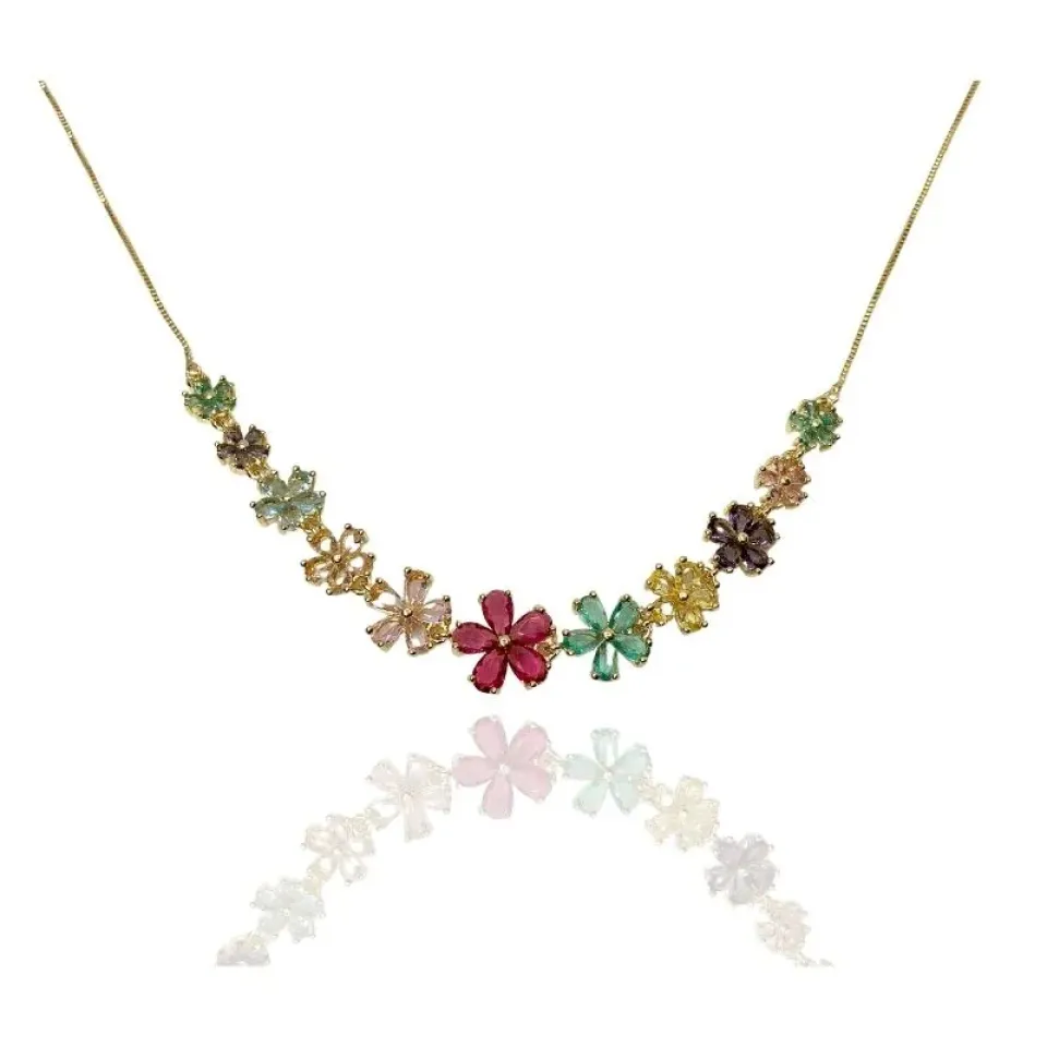 Colar flores com pétalas de zircônias, cada flor de uma cor