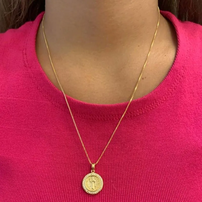 Colar medalha São Bento tamanho P cravejado na frente zircônias cristais corrente veneziana