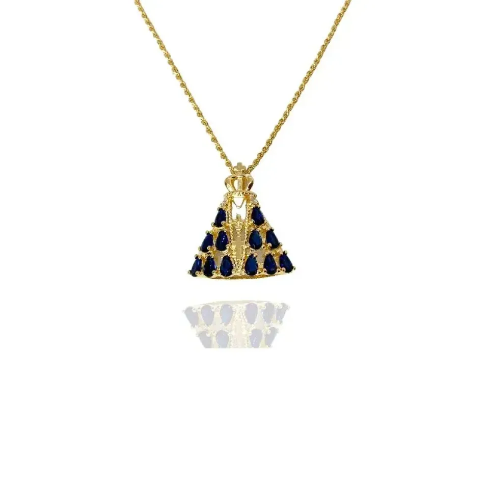 Colar Nossa Senhora Aparecida grande com manto em gotas de zircônias azul bic e corrente cordão baiano