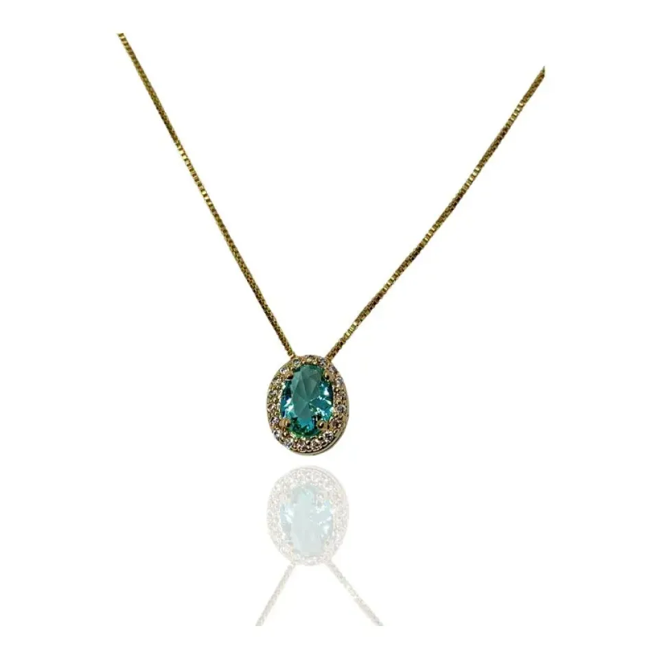 Colar pingente princesa oval zircônia azul aqua no meio e cravejado com zircônias cristais em volta