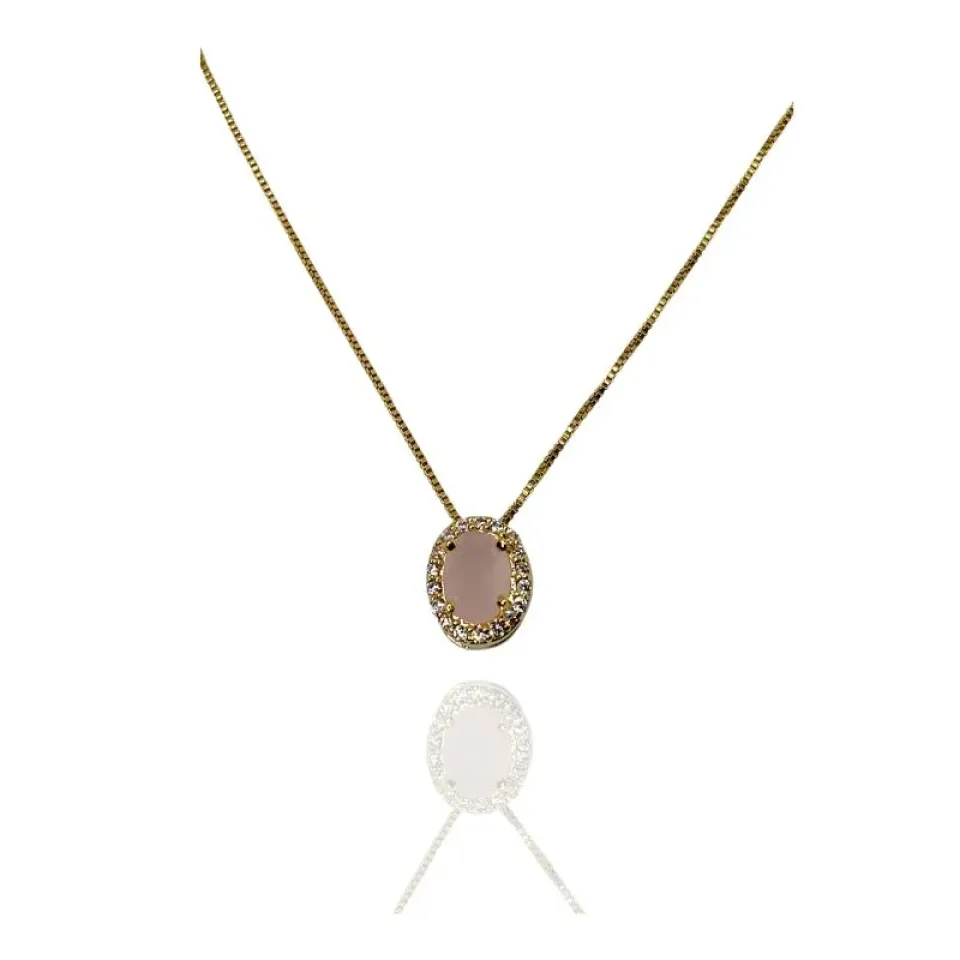 Colar pingente princesa oval zircônia rosa no meio e cravejado com zircônias cristais em volta
