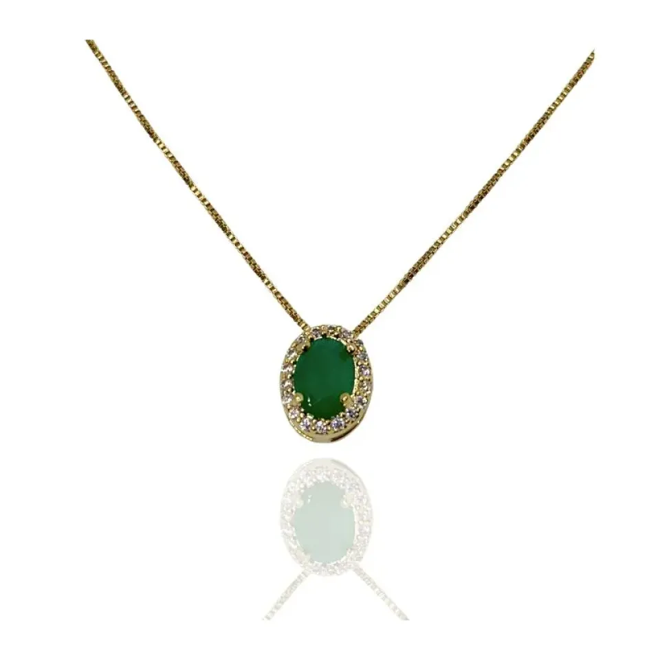 Colar pingente princesa oval zircônia verde esmeralda no meio e cravejado com zircônias cristais em volta