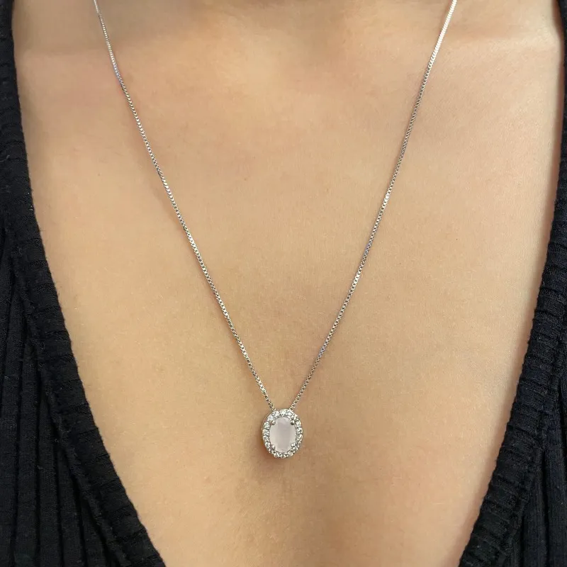 Colar pingente princesa oval zircônia rosa no meio e cravejado com zircônias cristais em volta