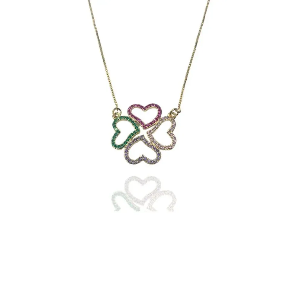 COLAR TREVO DE 4 CORAÇÕES CRAVEJADOS COLORIDOS