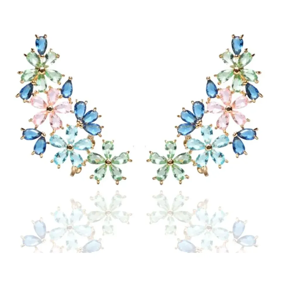 Brinco ear cuff flores em gotas de zircônias coloridas