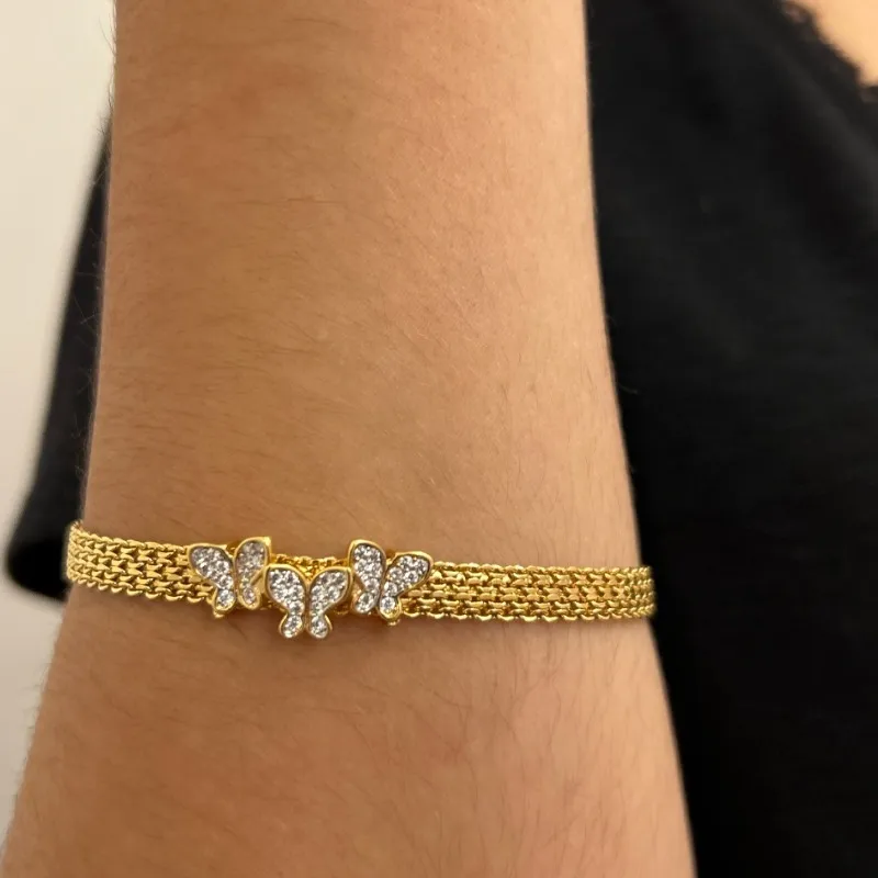 Pulseira malha com 3 borboletas cravejadas com fecho boia