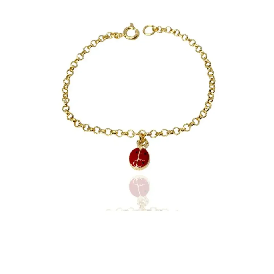 XPulseira infantil corrente elo português e pingente joaninha resinada