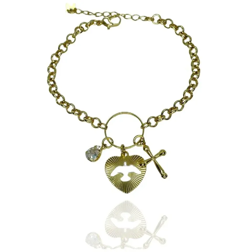 Pulseira elo português com patuá pingentes espiríto santo, cruz e gota